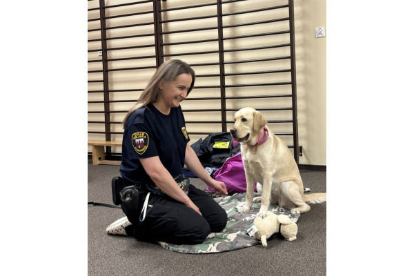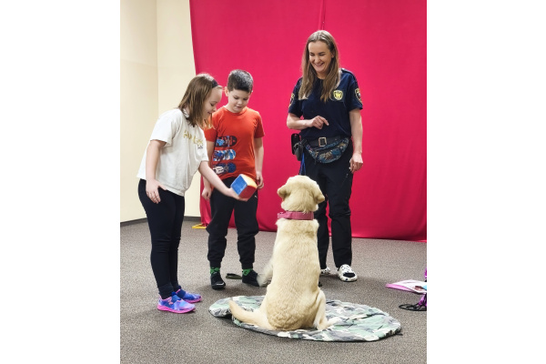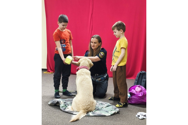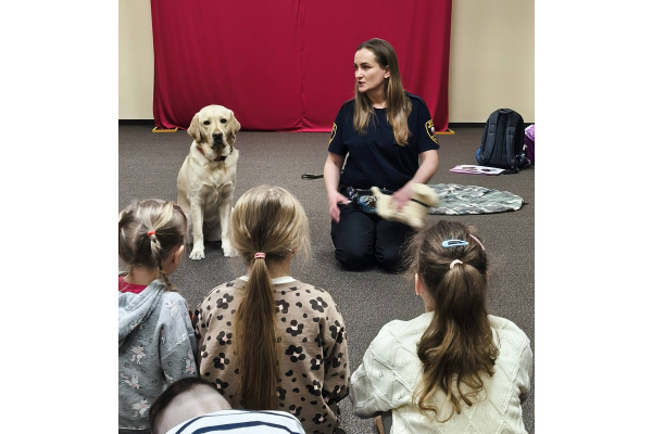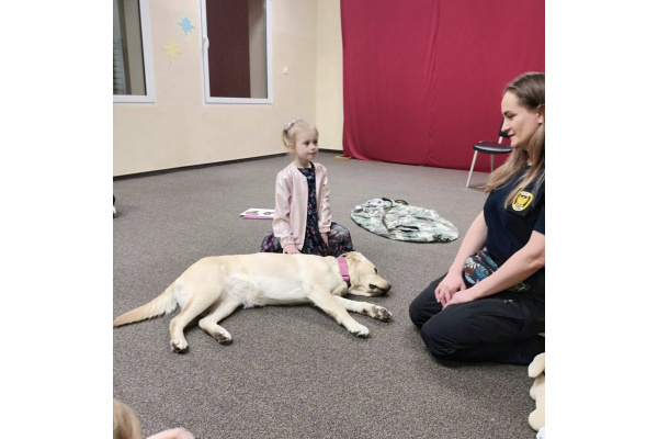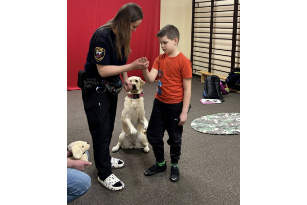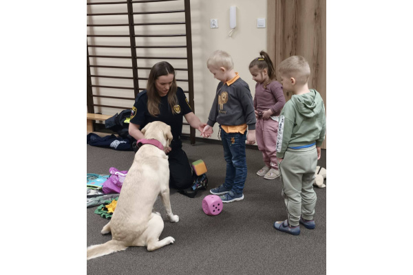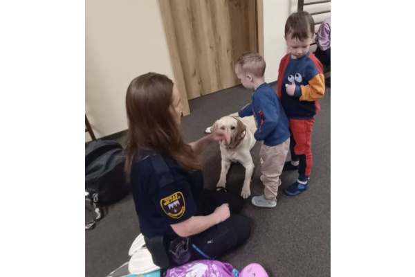W naszym przedszkolu 16 marca 2026 r. odbyły się zajęcia profilaktyczne prowadzone przez strażniczkę miejską, która odwiedziła nas razem ze swoim psem o imieniu Labi. Dzieci miały okazję dowiedzieć się, na czym polega praca strażnika miejskiego oraz jak ważną rolę mogą pełnić odpowiednio wyszkolone psy. Pani strażniczka opowiedziała dzieciom, jak należy bezpiecznie zachowywać się w obecności psa oraz jak dbać o zwierzęta. Labi zaprezentował kilka swoich umiejętności i bardzo spokojnie współpracowała z dziećmi podczas krótkich ćwiczeń. Przedszkolaki mogły także pogłaskać pieska i zobaczyć z bliska, jak wygląda jego praca. Spotkanie było bardzo interesujące i sprawiło dzieciom wiele radości. Dzięki niemu przedszkolaki zdobyły nową wiedzę o bezpieczeństwie oraz pracy Straży Miejskiej.